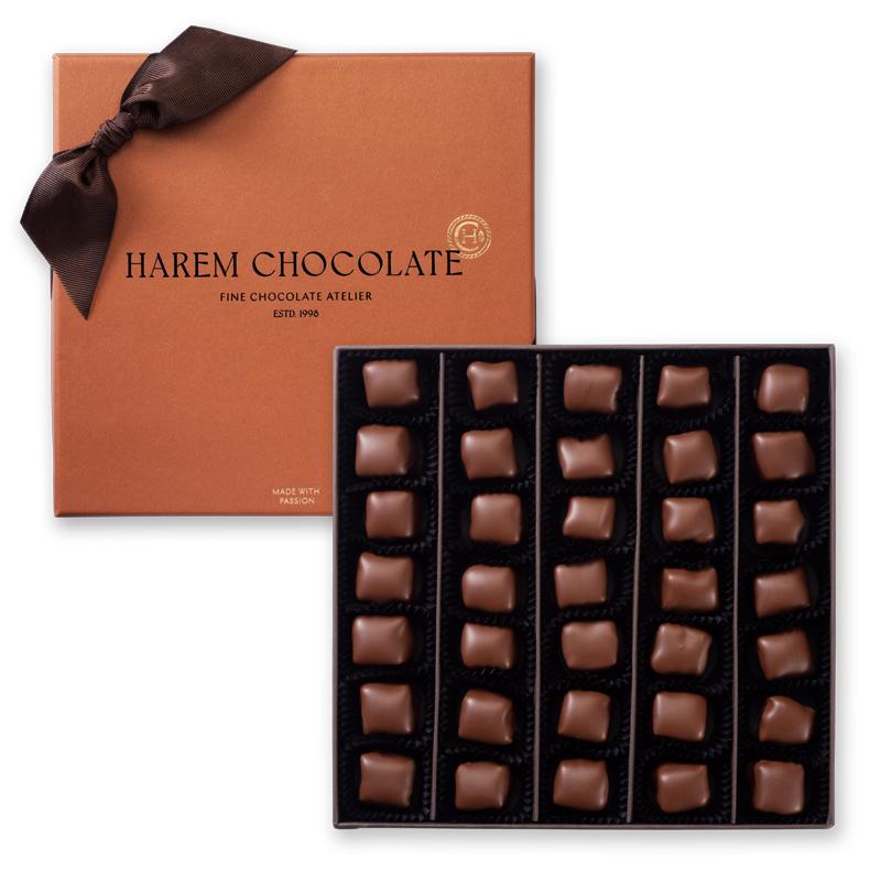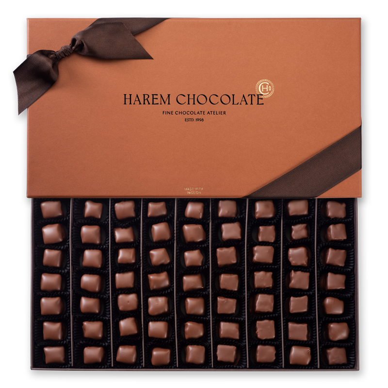 A meeting of two worlds — the traditional taste of pistachio Turkish delight and the creamy richness of milk chocolate by Harem Chocolate. A fusion of traditional and global flavor.